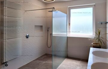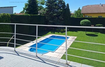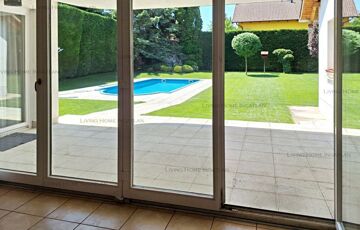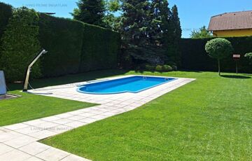 <p>The garden is landscaped by a gardener, lawned (automatic irrigation system from private well), evergreens, trees, roses, etc. Along the fences, the tall, neatly trimmed hedges ensure complete intimacy from the neighbours and the street for the residents. In one corner of the garden we can enjoy the sight and sound of an artificial large splashing waterfall. The garden pool measures 8x4 m and is 1.5 m deep, and can be heated.</p>