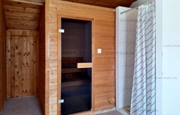 <p>Upstairs there is a living room and two bedrooms with access to the balcony, a closet and a bathroom. A wellness room with sauna and shower has been created.</p>
