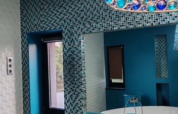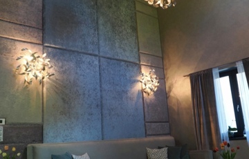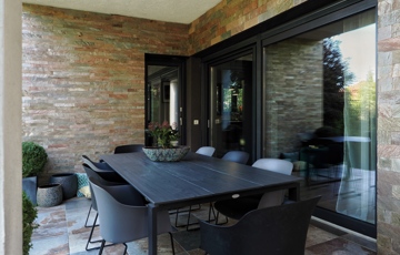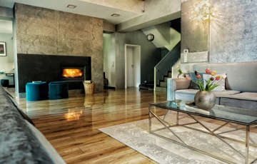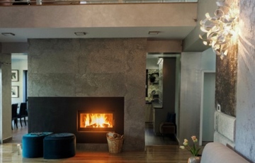 A ház fő éke a földszint izgalmas nappali-társalgó helysége, mely impozáns 6 métert meghaladó belmagasságával, kárpitozott falpanellel borított falával, a tökéletes komforthoz gyártott egyedi design bútoraival, és palakővel burkolt kandallójával magas fokon ad teret minden összejövetelnek.