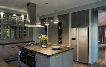 Az amerikai stílusú konyha a hatalmas konyhaiszigettel, beépített gépeivel, ipari szagelszívóval felszerelve páratlan élményt nyújt a főzésben. A konyha folytatásában elhelyezkedő étkezőből csodás kilátás tárul az egész kertre.