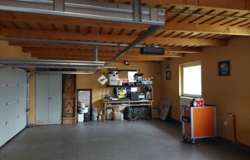 Utcafronton 3 állásos, elektromos Hörmann kapukkal felszerelt garázs épült, pakolható tágas tetőtérrel. A garázs alatt hűtőkamra, fatároló és műhely került kialakításra.