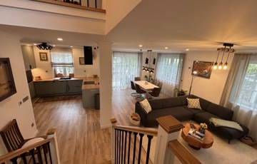 The ground floor features an elegant entrance hall and a bright, open-concept American-style kitchen–dining–living area — the heart of family life.