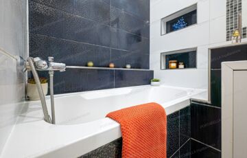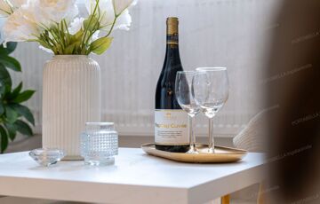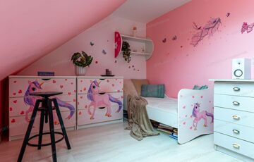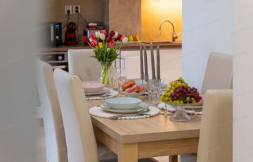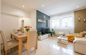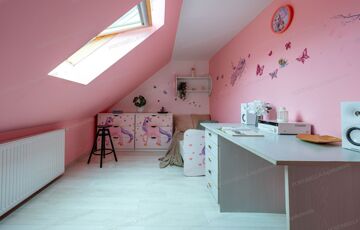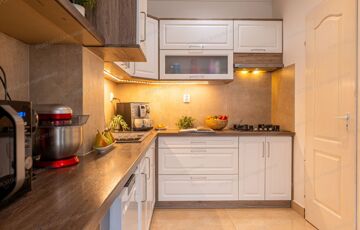 The spacious five-room property’s central feature is the open-plan living room with an American-style kitchen, offering a modern and attractive interior design suitable as a living, dining and social area.