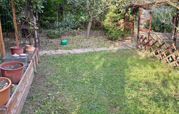 A telek végében konyhakert, mellette kis téglaépületek (állattartásra vagy tárolásra alkalmas).