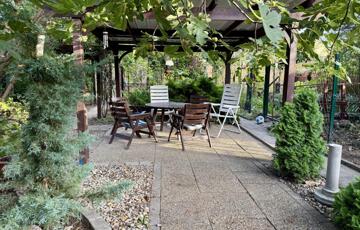 A kertben kerti tó, fa híd, dísznövények, gyümölcsfák, örökzöldek, fedett filagória, valamint kültéri sütögető is található.