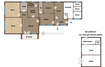A telken található egy melléképület, amelyben garázs, nyári konyha, tároló és WC kapott helyet. A melléképület is teljes közművel rendelkezik (víz, villany, gáz, szennyvíz).