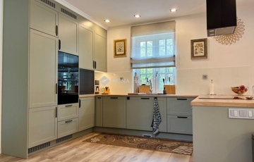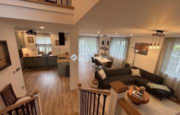 On the ground floor, you are welcomed by an elegant entrance hall, leading into a spacious American-style kitchen, dining area, and living room in one open space, serving as the heart of family life.
