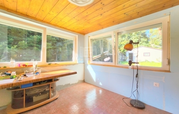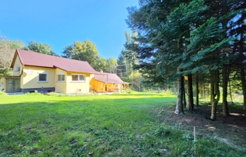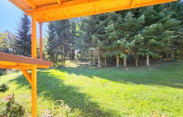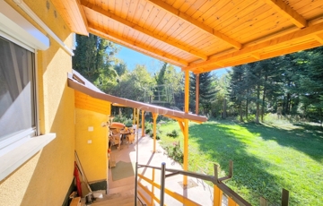 A két épületrészt egy, az egész ház előtt végigfutó, 30 m2-es fedett terasz köti össze, ahonnan csodálatos panoráma nyílik a házat körülölelő fenyőerdőre.