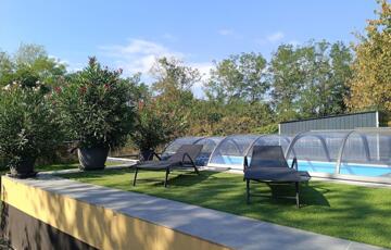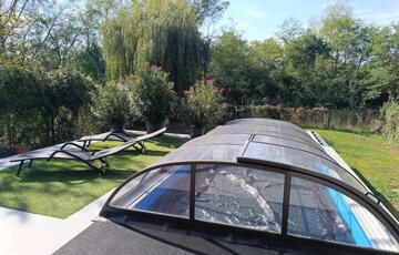 Már az udvaron megérzed a harmóniát: a 5×3 méteres, fedett medence, a műfüves napozórész és a tágas, fedett terasz gázos grillel hívogat, hogy eltölts egy nyugodt délutánt a családdal vagy barátokkal. A hátsó kertből az erdő látványa köszönt vissza – igazi feltöltődés minden nap.
