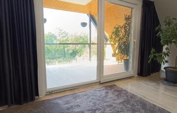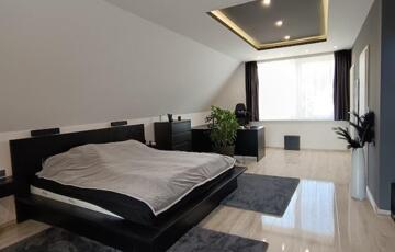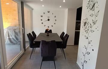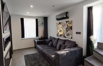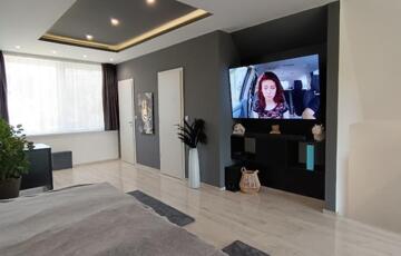 Az alsó szinten padlófűtés, modern LED világítás, klíma, antracit kanapé, Samsung TV és házimozi, valamint egy stílusos konyha gránit mosogatóval és rejtett konnektorokkal vár. Kerámia étkezőasztal hat székkel hívogat egy kellemes étel elfogyasztására