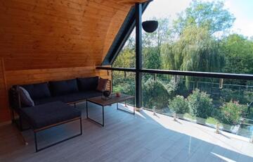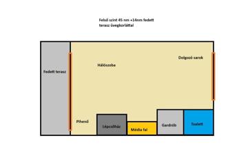 Az emeletre vezető lépcső után egy világos, tágas hálótér fogad, hatalmas franciaággyal, dolgozósarokkal, LG TV-vel, házimozival és tetőklímával. Innen nyílik a hangulatos, fedett terasz, ahol jólesik reggel kávézni, miközben hallgatod az erdő madarait. A felső szint nagy szobája könnyen egy gipszkarton fallal leválasztható így alakítható ki a 3 szoba.