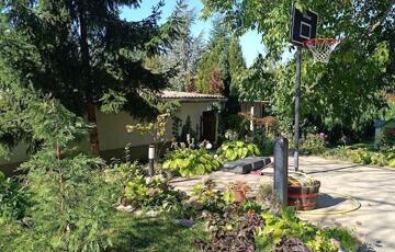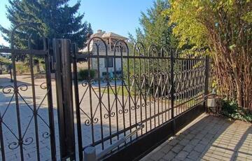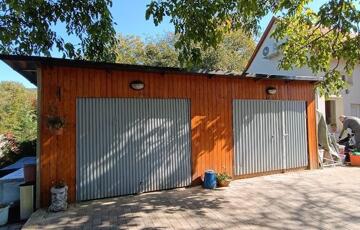 A 1000 m²-es, rendezett telek térkövezett, a bejáratnál elektromos kapu nyílik, és egy dupla beállásos, könnyűszerkezetes garázs is helyet kapott.