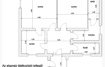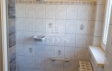 Tágas előtérből nyílik a zuhanyzós fürdőszoba WC-vel, a konyhából (konyhabútor+gáztüzhely) pedig egy kamra, ahonnan a padlástérbe van feljárási lehetőség.