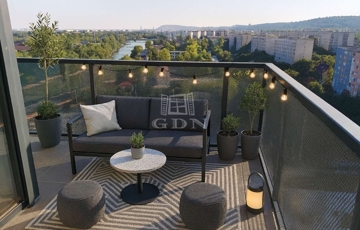 A nappaliból és a hálószobákból egyaránt közvetlen kijárat nyílik a 18 m²-es panorámás erkélyre, amely tökéletes helyszín a reggeli kávéhoz vagy esti naplementéhez.