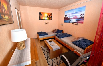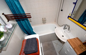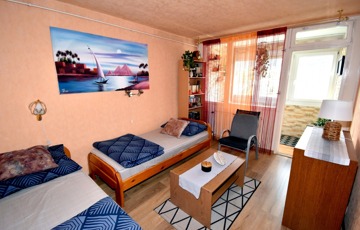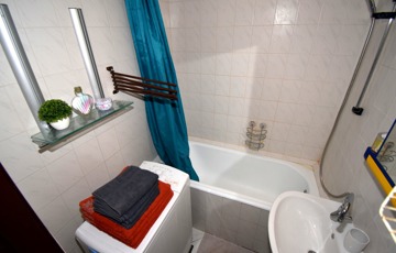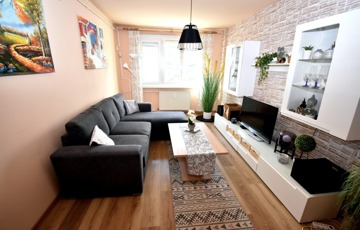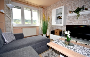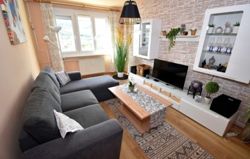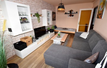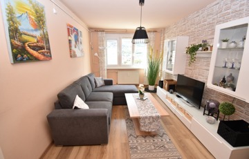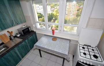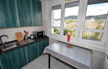 A két különnyíló szoba (12 és 17 m²) laminált parkettával burkolt, a többi helyiség járólapos. A fürdőszoba kádas, a WC külön helyiségben kapott helyet. A világos, nagy ablakos konyhából és az étkezőasztaltól is csodás kilátás nyílik a hegyekre.