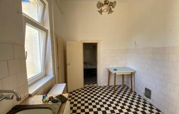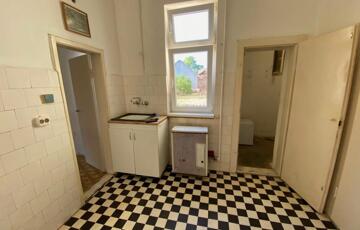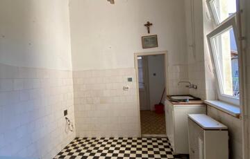 A konyha kertre, illetve belső udvarra néz, praktikus kamrával, mely lebontható, mert látott már szebb napokat.