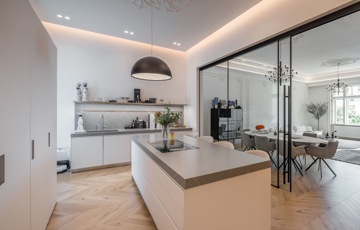 Konyha: olasz design, prémium kategóriás elemek (rejtett ajtók, quartz munkalapok, felsőkategóriás gépek)