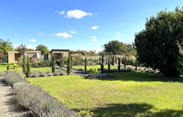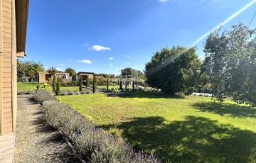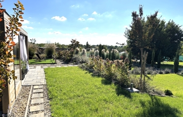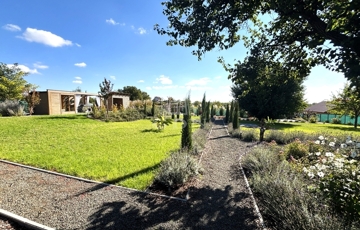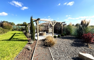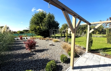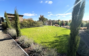 - A KÖRBÉKERÍTETT, füvesített kert dísznövényekkel és KERTI SÜTÖGETŐVEL, került kialakításra.