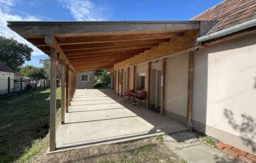 A ház előterében tágas, fedett terasz várja az új lakókat – ideális hely a reggeli kávéhoz vagy a nyári családi vacsorákhoz. A terasz mérete lehetővé teszi akár 2-3 autó kényelmes beállását is.