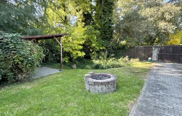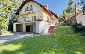 Enyhén lejtős, kettő utcára nyíló telek, gyönyörűen parkosított, ősfás, kerti tavas terület, kerti szaletlivel, gyerek játszóval.