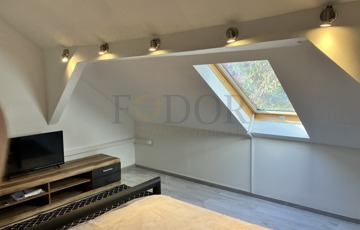 A teraszról lépcső vezet a beépített tetőtérbe, ahol egy teljes értékű szoba és egy gardrób található.