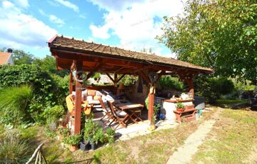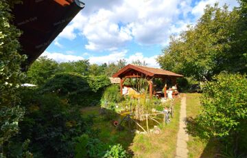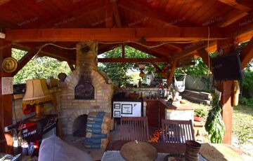 A ház mögött megtalálható egy kis dísztó aranyhalakkal. Ezt követően szintén balkéz felől egy oldalról nyitott nyári konyha következik kemencével, mosogatóval, sparhelttel. A fa szerkezetű filagória (kb 20 m2) betoncserépfedést kapott, nagyszerű hely ez baráti összejövetelekre, kinti főzőcskére.