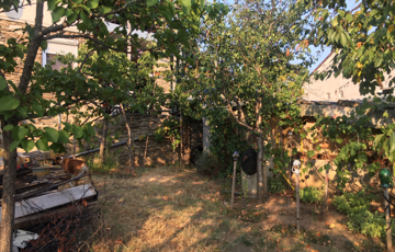 A telek 529 m2-es, enyhén lejtő. Két utcából is megközelíthető. Két autó parkolását biztosítja a kert végében elhelyezett fedett beálló. A kertben termő gyümölcsfák állnak.