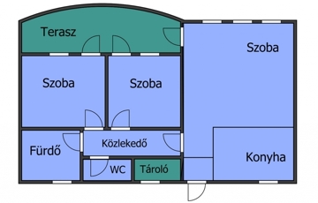 - 2 hálószoba, Nappali + Konyha + Étkező, Fürdőszoba, Tároló