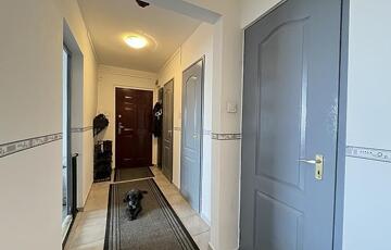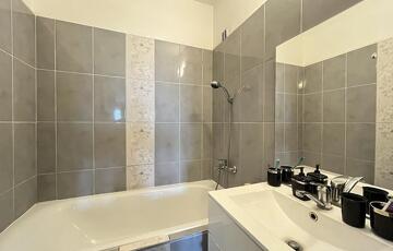 A fürdőszoba új burkolatot kapott, kádas. A mosógép be-és kiállása a gardróbszobába lett kialakítva.