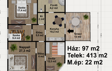 - Az 413 m2-es telken, a ház mellett található egy 13 m2-es fedett terasz és egy 22 m2-es több helyiségből álló tároló