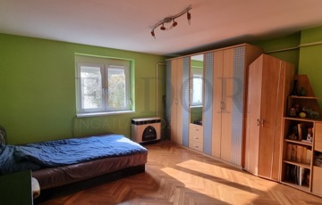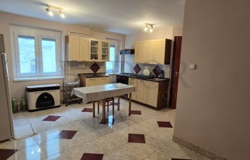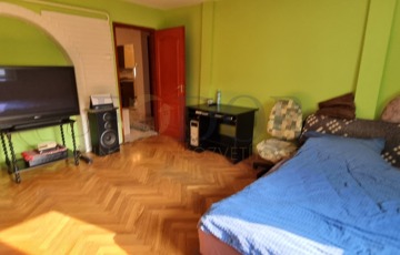 A nappali és a konyha járólappal, míg a nagyszoba fa parkettával van burkolva.