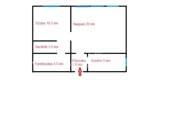 Az előtérből nyílik a 22 nm-es nappali szoba , mellette lépünk a 10.5 nm-es hálószobába. ahol helyet kapott a 3.5 nm-es gardrób helyiség.