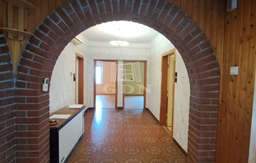 - Az üveges teraszról a szép tágas előtérbe jutunk, innen nyílik a konyha étkezővel, a 3 szoba és a fürdőszoba WC-vel. A konyhából még egy tágas kamra is található, a padlás feljáróval. .