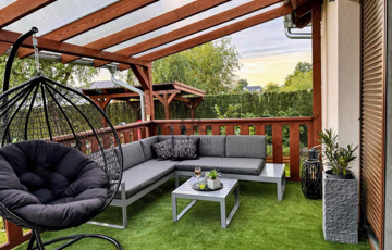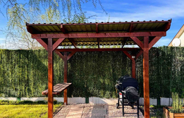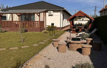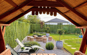 Tágas, parkosított kert 725 m²-en, egy fedett terasszal (17,93 m²), fa fedésű kerti pihenővel és grillezőrésszel.
