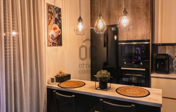 A tágas, világos nappali-étkező prémium fa bútorokkal, lágy textúrájú textilekkel és ízléses dekorációval gazdagodik, mely relaxált, ugyanakkor kifinomult légkört teremt. A magas minőségű anyagok és a természetes fényáradat egyedi atmoszférát alkot.