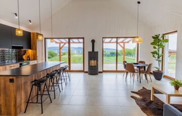 A ház belső tere világos, tágas, nagy üvegfelületei összekapcsolják a lakóteret a természet közelségével. A konyha-nappali-étkező egybenyitott központi térként szolgál, ahol a fatüzelésű, külső levegő bevezetésű Romotop kandalló és a panoráma együtt teremti meg a hangulatot.