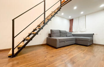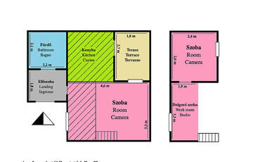 A lakás alsó szinten tágas előszoba, zuhanyzós fürdőszoba és amerikai konyhás nappali található, ahonnan privát, lichthofból kialakított terasz-rész elérhető. Az emeleten dolgozónak kialakított hall-rész, hálószoba.