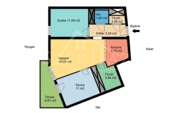2 külön bejáratú szoba, amerikai konyhás nappali, külön fürdő és külön WC, valamint egy 6,6 m²-es terasz biztosítja a kényelmet és a jó helykihasználást.