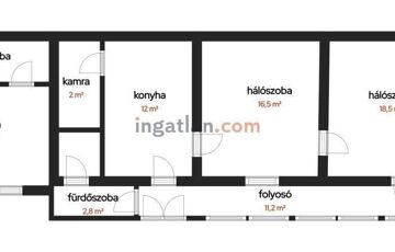 Konyha (12 nm), 2 szoba (18,5 és 16,5 nm), nyárikonyha (11,6 nm), fürdőszoba (2,8 nm), kamra (2 nm), háztartási helyiség (4,3 nm) és veranda (11,2 nm).