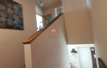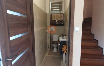 Egyedileg díszített emeleti fürdőszoba, káddal, WC-vel, az alsó szinten külön WC, tároló szoba a lépcső alatt.