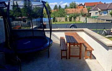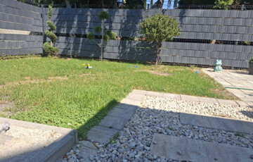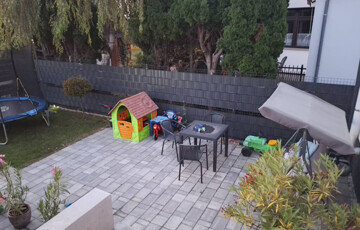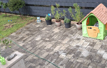 - 55 m2 elkerített hátsó kert nagyobb részt térkövel