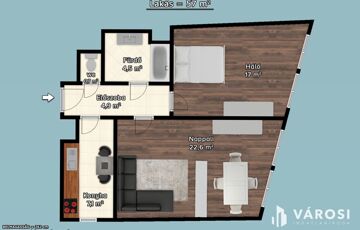 Az ingatlan egy hangulatos nappaliból, tágas szobából, egy modern fürdőszobából, különálló WC-ből, valamint ablakos konyhából áll.