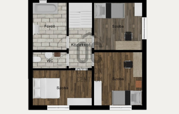 • 1 földszinti szoba (nappali), 3 emeleti hálószoba