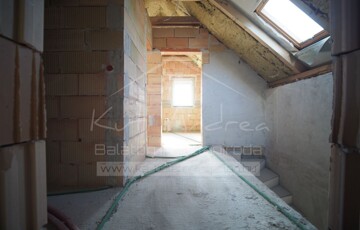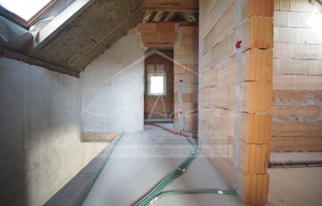 Emelet: 2 szoba (lehetőség van 3 szoba kialakítására), 1 nagyobb fürdő épített zuhanyfülkével, 1 mosókonyha, 1 közlekedő