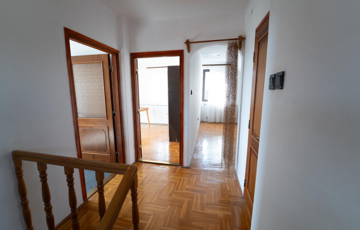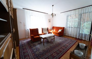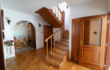 A 90-es évek elején épült, masszív szerkezetű családi ház két lakószinttel és teljesen alápincézett kialakítással rendelkezik. A pince szinten négy helyiség kapott helyet, köztük a garázs és a kazánház, ahol gáz- és vegyes tüzelésű kazán is biztosítja a fűtési lehetőségeket. Az alsó szinten a tágas előszoba után egy impozáns hall fogad, innen nyílik a 30 négyzetméteres nappali, az étkező és a konyha kamrával. Ugyanitt található egy hálószoba, egy fürdőszoba és egy külön wc is. A nappaliból egy 17 négyzetméteres fedett teraszra léphetsz ki, ahonnan a kert nyújt pihentető kilátást. Az emeletre széles falépcső vezet, ahol két nagyobb szoba került kialakításra, valamint egy kényelmes, világos fürdőszoba is szolgálja a család mindennapjait.
