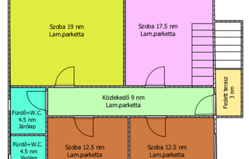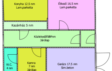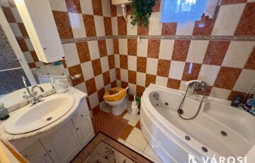 Helyiségei: az alsó szinten konyha, étkező, kamra, külön nyíló W.C., közlekedő, kazánház, garázs (elektromos kapuval), a felső szinten 4 szoba, közlekedő, 2 fürdőszoba.