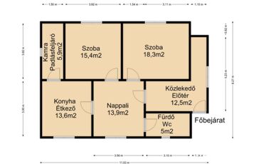 Belső lakrész helységei: konyha-étkező közvetlen kamrakapcsolattal, 2 külön bejáratú szoba, nappali, fürdő mellékhelységgel együtt, előszoba közlekedő.
