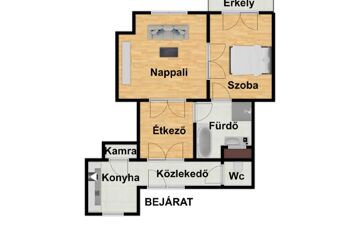 -74m2-es lakás(1 szoba, fürdőszoba, wc, konyha, közlekedő, étkező és nappali)
