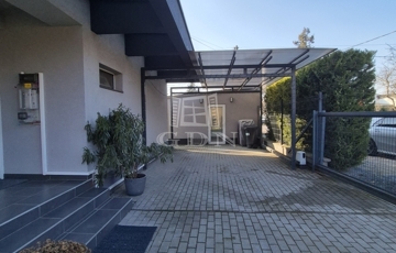 A telken az utcafrontról elektromos garázskapuval megközelíthető garázs is rendelkezésre áll, valamint az elektromos kertkapun keresztül egy fedett, térkövezett gépkocsibeálló is helyet kapott