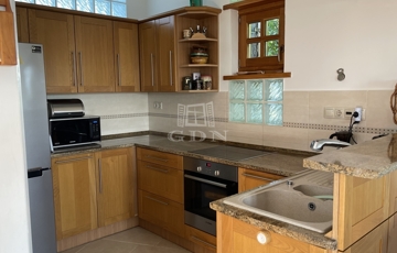 Földszint: nappali + étkező (19,8 m²) + konyha (7,2 m² ) légtérben split klímával, vendégszoba (8,9 m²) + zuhanyzós fürdő (2,4 m²)